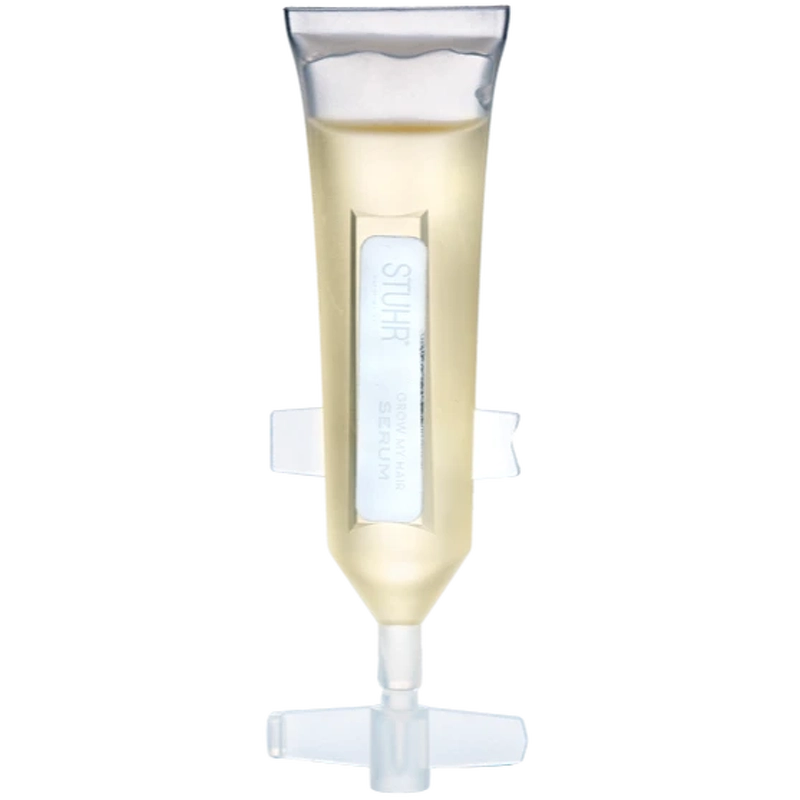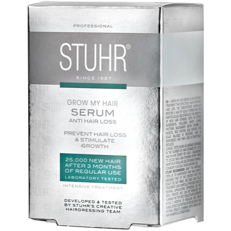 Stuhr Grow My hair Serum Ampoules er en intensiv kurbehandling, der effektivt modvirker hårtab. De koncentrerede ampuller genopretter en sund hovedbund, styrker hårsækkene, og stimulerer væksten af nye hårstrå. Med 16 aktive ingredienser, herunder proteiner fra hvid lupin, niacinamid, biotin, E-vitamin, inositol, risprotein og keratin, genoprettes balancen i hovedbunden, håret styrkes, og hårtab modvirkes effektivt. Kliniske tests viser en gennemsnitlig stigning i antal hårstrå på +21 % og hårets fylde på +22 % - svarende til 25.000 nye hår efter tre måneders regelmæssig brug.