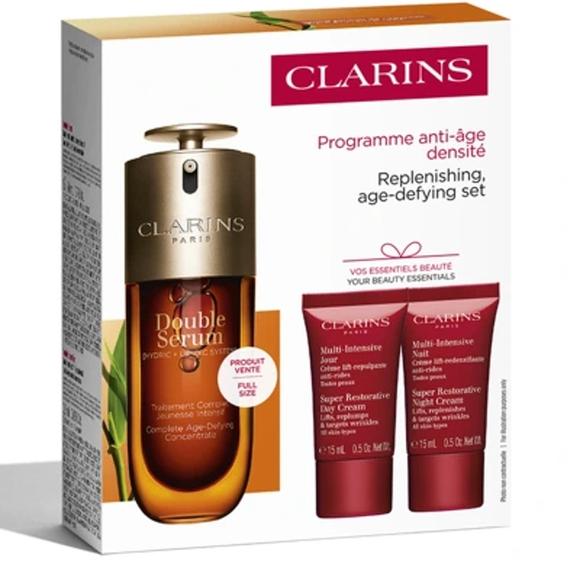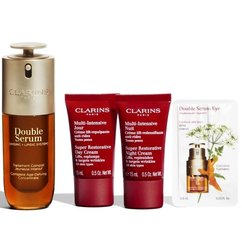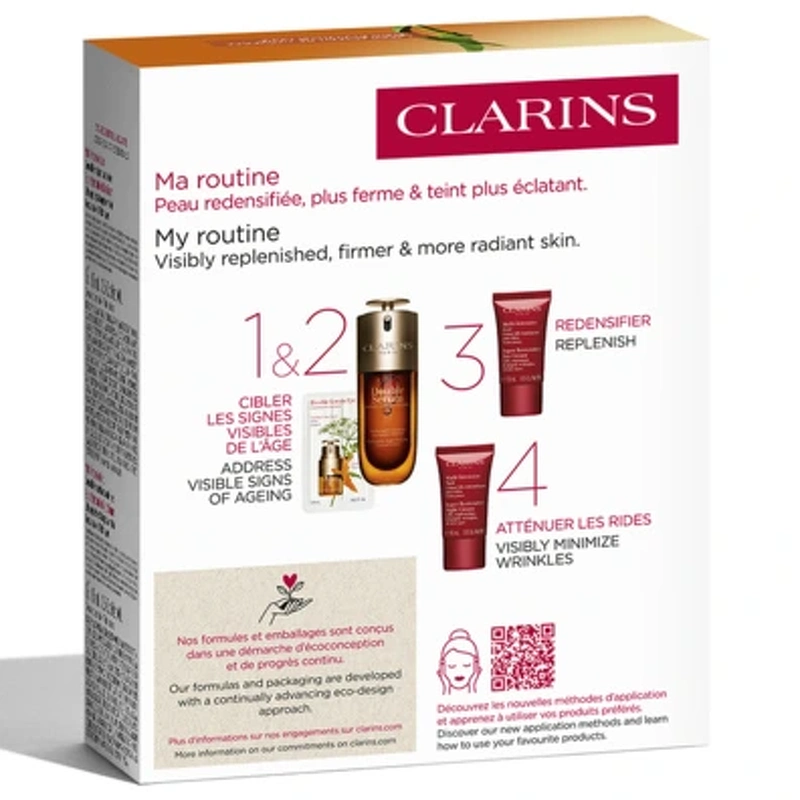 I dette sæt finder du den ikoniske Double Serum med 27 planteekstrakter og en duo af genopbyggende og udglattende anti-ageing dag- og natcremer med harungana ekstrakt. Dag efter dag bliver huden glattere og genopbygget, ansigtets konturer omdefineres, og rynker reduceres synligt. Til øjnene hjælper Double Serum Eye med at reducere rynker og opstrammer den sarte hud omkring øjnene for at give et mere ungdommeligt og revitaliseret udseende.