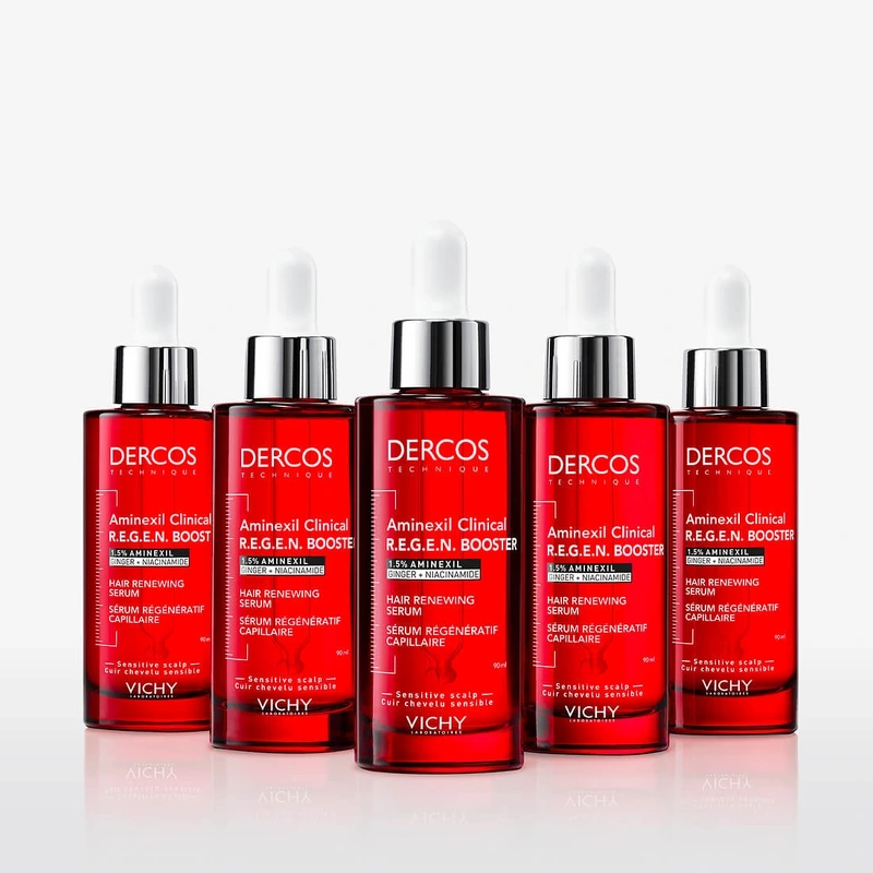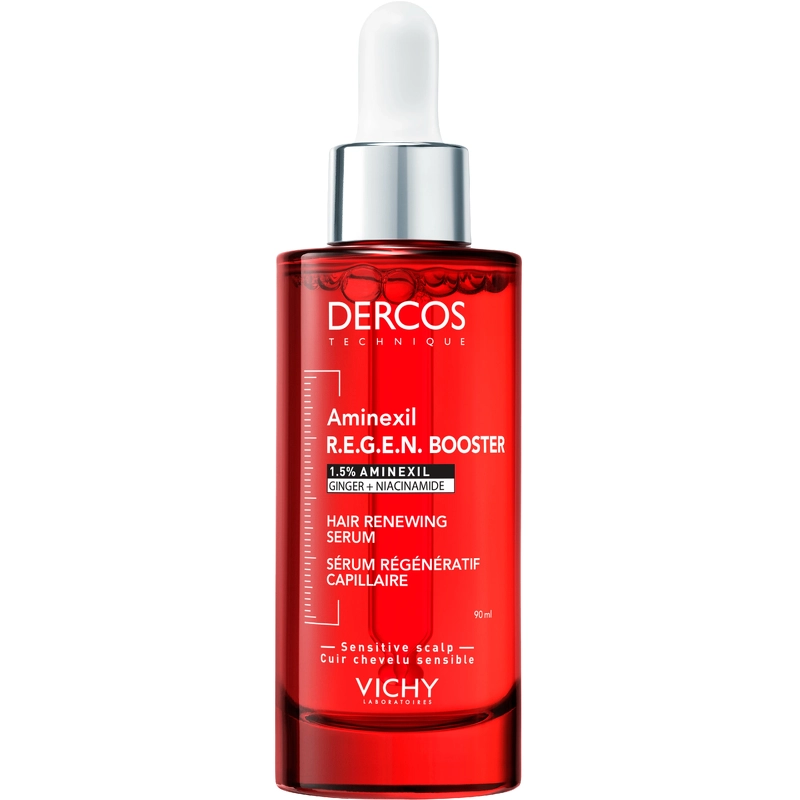 Vichy Dercos Aminexil R.E.G.E.N. Booster Serum er et styrkende serum, der hjælper med at minimere periodisk hårtab ved at styrke håret og mindske risikoen for, at hårstråene knækker.