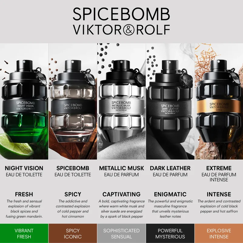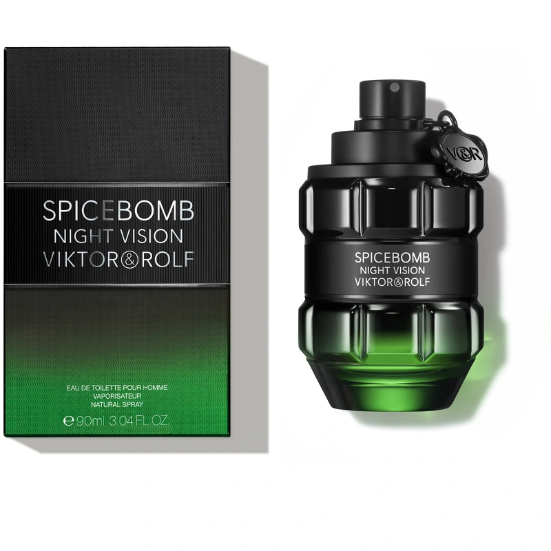 Viktor & Rolf Spicebomb Night Vision Pour Homme EDT er ren maskulinitet i en rå flakon der er formet som en håndgranat, og kommer i en sort og dyb grøn farve, der fortæller lidt om hvem duften er til. Den indeholder nemlig noter fra blandt andet salvie, appelsin, æble, kardemomme, peber, grapefrugt, tonkabønner, mandler, chili, varmt træ og muskatnød. Dette kan lyde af mange forskellige dufte, men de er hver og én nøje udvalgt, og når de kombineres med hinanden, skaber de den helt rigtige og afmålte der balance, der fra første strejf, sender en et signal om at du er en mand med karakter.