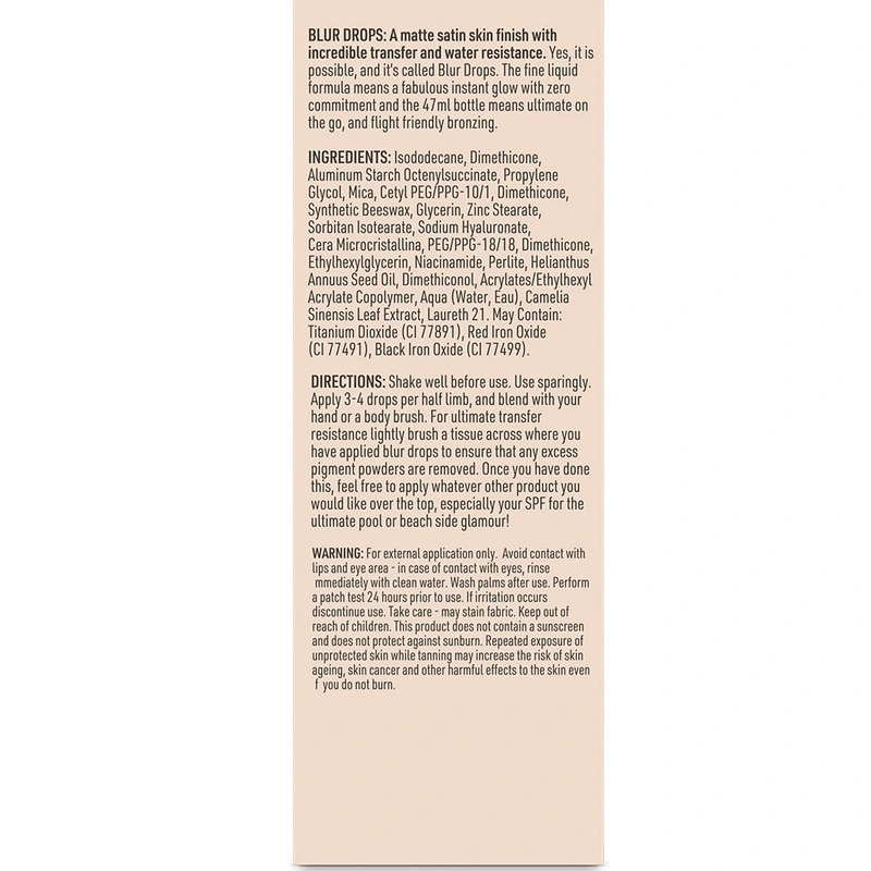 Vita Liberata Blur Drops er et revolutionerende kropsmakeup produkt, som har en smuk matte tekstur og satinagtig glans som er utrolig modstandsdygtig over for bade vand og afsmitning. Den fine flydende formel giver en fantastisk øjeblikkelig glød med et meget diskret skær, der tilføjer ekstra dimension i bestemt lys.