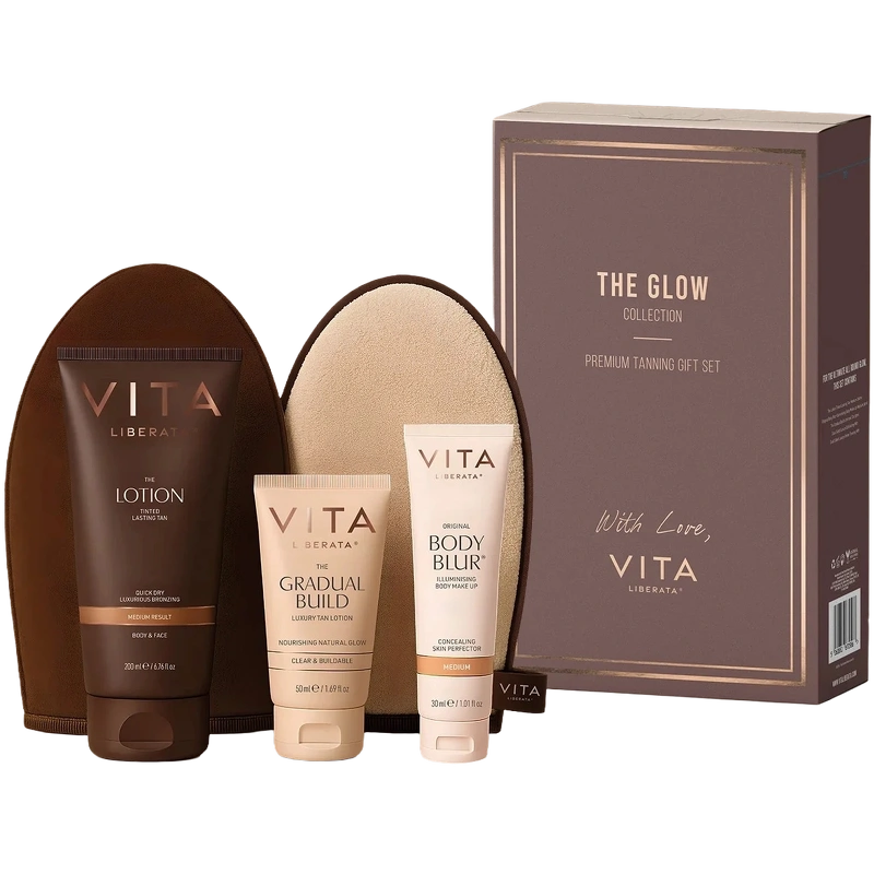 Vita Liberata The Glow Collection Gift Set er en gaveæske, som indeholder alt du behøver for at få den smukkeste solbrune glød.