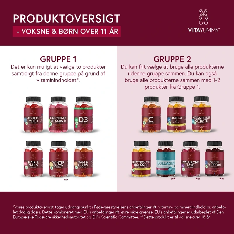 | Sikkerhedsinformation | Til voksne og børn fra 11 år. Opbevaring: Opbevares tørt, ved stuetemperatur og uden direkte sollys. Opbevares utilgængeligt for børn. Den anbefalede daglige dosis må ikke overskrides. Kosttilskud bør ikke træde i stedet for varieret kost. Indeholder sukker og sødestof. |