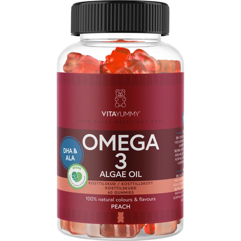 VitaYummy Omega 3 - Peach er en velsmagende og vegansk kilde til essentielle fedtsyrer, formuleret med DHA og ALA. Den er vegansk, da de aktive stoffer kommer fra alger og hørfrø, og derudover er VitaYummy Omega 3 egnet til både børn og voksne.