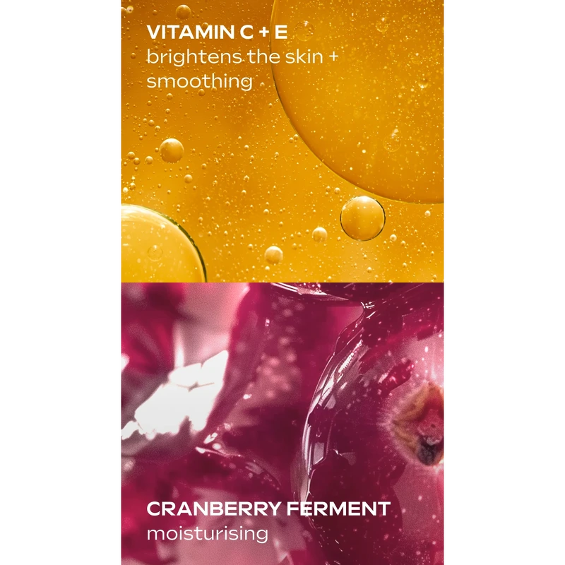 Dette serum er beriget med en effektiv trio af vitamin C, E og fermenteret tranebærekstrakt, som giver en klarere, mere ensartet og strålende hudtone – perfekt til dig med synlige porer og hud, som har behov for fugt.