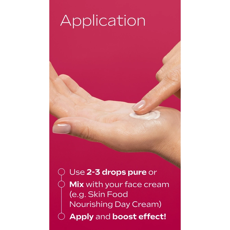 Anvend det hurtigabsorberende serum direkte på huden eller bland nogle dråber i din foretrukne ansigtscreme.