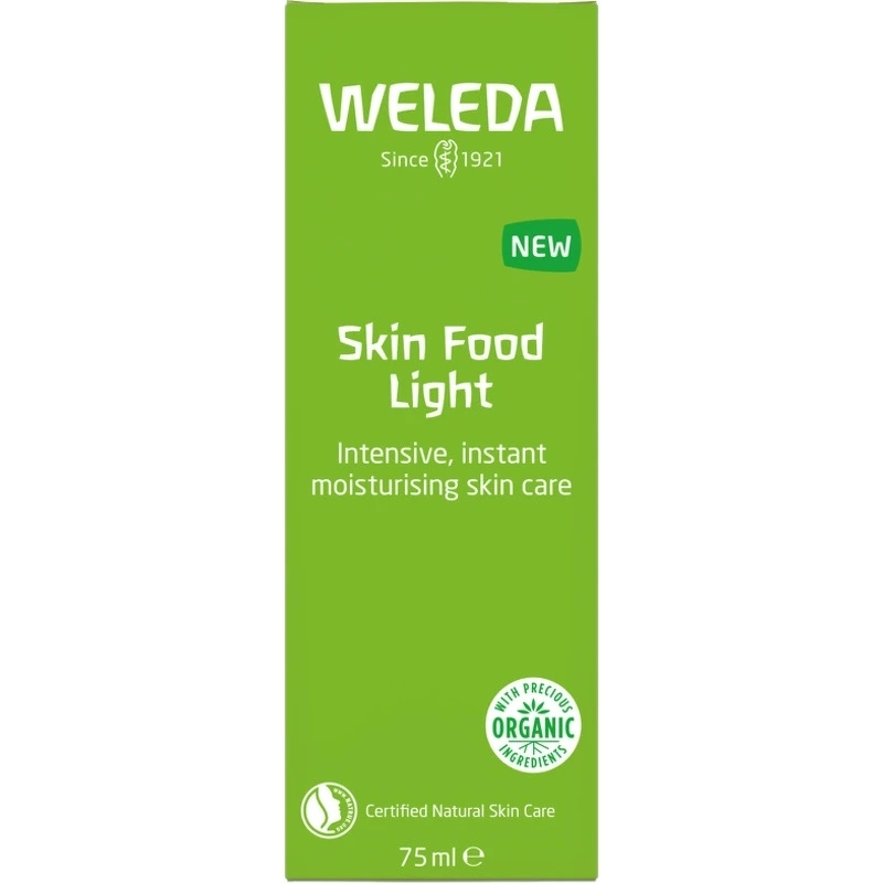 Weleda Skin Food Light er en intensiv og fugtgivende creme, der fungerer som et multiprodukt og gør din hud silkeblød øjeblikket. Cremen er en let variant af den originale Skin Food, som har en glat konsistens, hvilket trænger nemt og hurtigt ind i huden. Den let absorberende formel bestående af kamille, stedmoderblomst og morgenfrue, går dybt ind og plejer i huden. Derudover er der tilsat sheasmør, der beskytter og styrker hudbarrieren og giver huden den optimale fugt.
