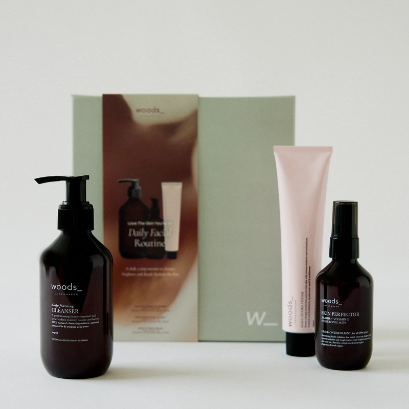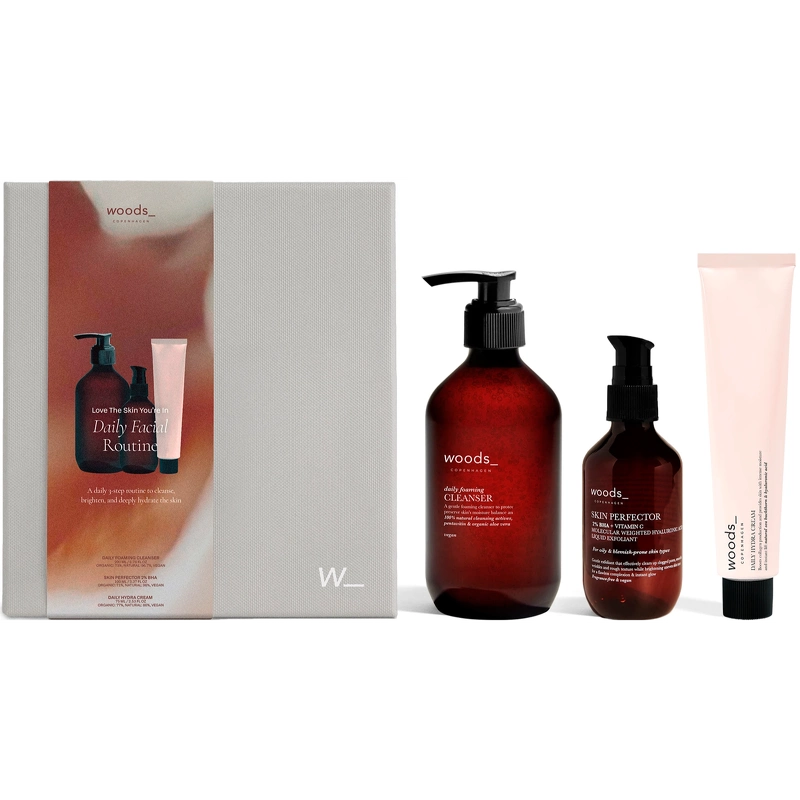 Woods_Copenhagen Love The Skin You're In - Daily Facial Routine Gift Set er en gaveæske med 3 produkter, som er udviklet til synligt at forbedre hudens tekstur, tone og fugtbalance. En 3-trinsrutine med nøje udvalgte aktive ingredienser, der arbejder både på overfladen og dybt i hudens lag.